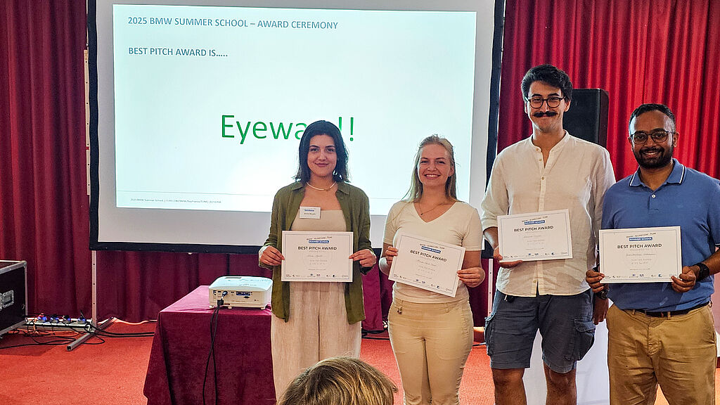 Ein besonderes Highlight der Woche war die sogenannte Lean Startup Machine: In interdisziplinären Teams entwickelten die Teilnehmenden aus ihren Forschungsthemen ein tragfähiges Geschäftsmodell und wurden dabei durch Coachings von BMW-Innovationsmanagerinnen und -managern unterstützt. Das Team um Ramakrishnan Subramanian setzte sich mit der Idee „Eyeway“ durch und gewann den Best Pitch Award.