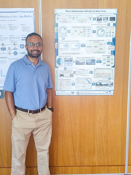 Ramakrishnan Subramanian stellte ein Poster mit dem Titel „When Autonomous Vehicles hit their limits“ vor, das sich mit den Grenzen autonomer Fahrsysteme im realen Einsatz befasst. Der Schwerpunkt lag darauf, wie automatisierte Fahrzeuge auf unsichere Bedingungen reagieren, die aufgrund von Situationen entstehen, für die sie nicht ausgelegt sind. Zu den wichtigsten Anwendungsfällen zählen rutschige Straßen, schlechte Sichtverhältnisse, die die Sensoren beeinträchtigen, sowie vorübergehende Ereignisse auf Straßen, wie Baustellen oder Sperrungen aufgrund von Unfällen. Im Fokus stand dabei die Frage, wie solche Situationen frühzeitig erkannt und sicher kontrolliert werden können.