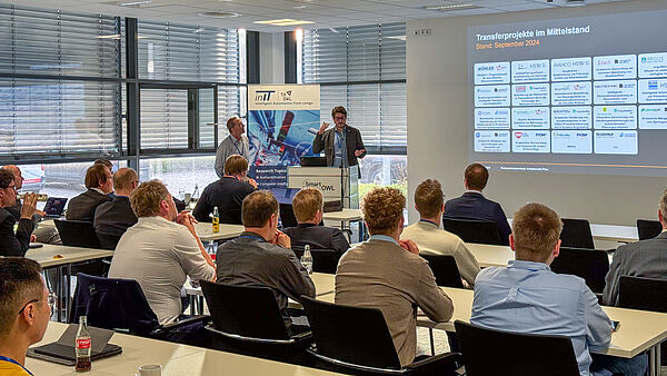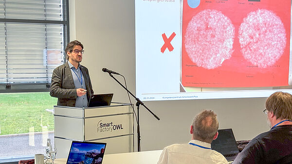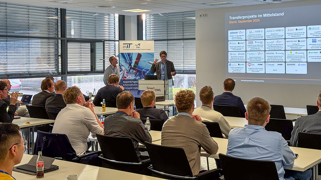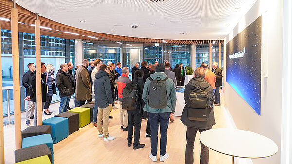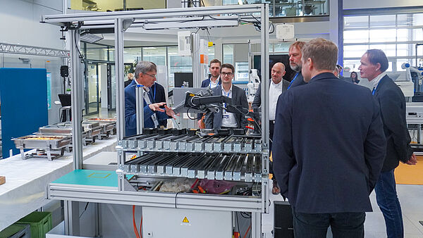 Während einer Führung durch die SmartFactoryOWL hatten die Teilnehmerinnen und Teilnehmer die Möglichkeit, die innovative Forschungsumgebung auf dem Campus näher kennen zu lernen. Auf diesem informativen Rundgang stellte Prof. Dr. Volker Lohweg einige Demonstratoren vor.