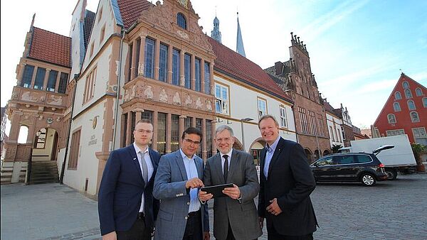 Am Donnerstagvormittag traf eine kleine Delegation um Professor Jürgen Jasperneite, Leiter des Fraunhofer IOSB-INA, im Rathaus der Alten Hansestadt Lemgo mit Bürgermeister Dr. Reiner Austermann zusammen, um die erste Version des City-Cockpits für Lemgo zu überreichen. Austermann hält nun sozusagen das digitale Abbild seiner Stadt in den Händen; dieses ist allerdings nicht nur ihm vorbehalten, denn alle Interessierten erhalten unter der Adresse https://dashboard.lemgo-digital.de/ ebenfalls Zugriff auf das Dashboard.