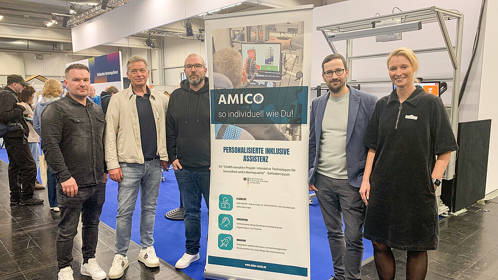 Der Demonstrator wurde von den Bottroper Werkstätten zur Verfügung gestellt. Das Messeteam – Peter Przestrzelski und Andreas Lingenau (Bottroper Werkstätten gGmbH), Fabian Zodrow und Anja Große-Coosmann sowie Mario Heinz-Jakobs – leitete Besucherinnen und Besucher an und stand für Fragen und Gespräche zur Verfügung.