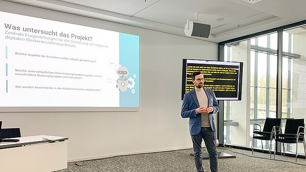 Neben dem Vortrag präsentierte das Projektteam einen Demonstrator, der den praktischen Einsatz eines digitalen Assistenzsystems veranschaulicht. Interessierte konnten sich direkt vor Ort ein Bild davon machen, wie technische Unterstützung Arbeitsprozesse begleiten und Beschäftigte bei einzelnen Arbeitsschritten unterstützen kann.
