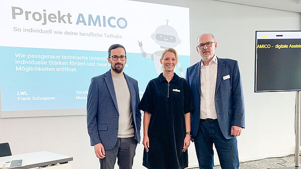 Mario Heinz-Jakobs, wissenschaftlicher Mitarbeiter in der Arbeitsgruppe Mensch-Technik-Interaktion unter der Leitung von Prof. Dr. mult. Carsten Röcker, hielt gemeinsam mit Anja Große-Coosmann (Wertkreis Gütersloh) und Frank Schrapper (LWL) einen Vortrag mit dem Titel: „AMICO: Digitale Assistenzsysteme, so individuell wie deine berufliche Teilhabe“.