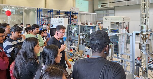 Ein weiterer Stand, der von den inIT-Auszubildenden Jannik Peters und Tim Esau betreut wurde, war die Popcorn-Maschine. Die Besucherinnen und Besucher konnten sich von der Anlieferung bis zur Produktion per Knopfdruck anschauen, wie aus Maiskörnern Popcorn hergestellt wird. „Anhand der einzelnen Module, aus der die Popcorn-Maschine besteht, konnten wir den Interessierten ein anschauliches Beispiel für die industrielle Kommunikation präsentieren“, sagt Auszubildender Tim Esau. Auch hier sind immer wieder interessante Konversationen entstanden, bei denen es sich oft um die zukünftige Optimierung der Popcorn-Maschine gehandelt hat. Diese Station war, besonders neben Menschen, die gerne Popcorn essen, attraktiv für Studieninteressierte im Bereich der Informatik. Ausschlaggebend hierfür ist, dass die Maschine stets weiterentwickelt und als Lernumgebung verwendet wird.