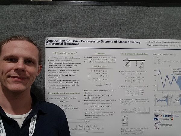 Der wissenschaftliche Mitarbeiter aus der Arbeitsgruppe „Mathematik und Datenwissenschaften“ von Prof. Markus Lange-Hegermann stellte das Paper mit dem Titel „Constraining Gaussian Processes to Systems of Linear Ordinary Differential Equations” dem sehr interessierten Publikum auf einer Poster-Session vor. Es wird in Kürze in dem Tagungsband der NeurIPS veröffentlicht.