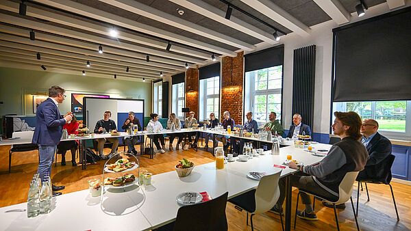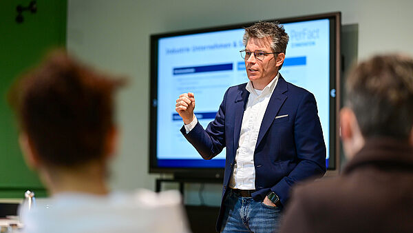 Zum Auftakt begrüßten Beiratsmitglied Dr. Robert Rae, PerFact Innovation GmbH & Co. KG, sowie inIT-Vorstandsmitglied Prof. Dr. Lukasz Wisniewski die Teilnehmenden in der Startup Lounge und hoben die Bedeutung des Austauschs zwischen Wirtschaft und Hochschule hervor.