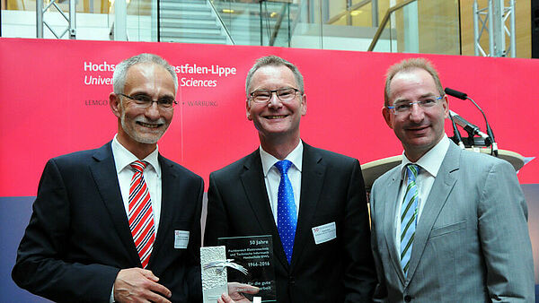 Zur Jubiläumsfeier waren zahlreiche Beschäftigte, Studierende, Alumni, Freundinnen und Freunde sowie Partner des Fachbereichs erschienen. „Der Fachbereich Elektrotechnik und Technische Informatik ist eine tragende Säule der Hochschule OWL”, erklärte Hochschulpräsident Dr. Oliver Herrmann. Mit der hohen Summe an eingeworbenen Drittmitteln, den zwei profilbildenden Forschungsbereichen inIT und IES sowie der Beteiligung an der neu eröffneten SmartFactoryOWL sei der Fachbereich ein Vorbild an Innovationskraft und Forschungsstärke. Die exzellente Lehre sei in den vergangenen Jahren immer wieder für ihre Praxisnähe und vorzüglichen Studienbedingungen ausgezeichnet worden.