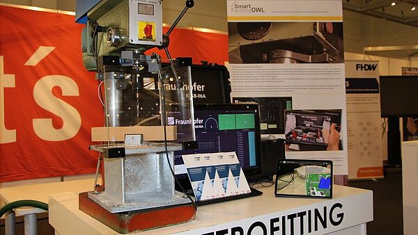 Auch das Institut für industrielle Informationstechnik (inIT) und das Fraunhofer IOSB-INA stellten auf dem it´s OWL-Gemeinschaftsstand ihre Neuheiten vor. Thematisch handelte es sich dabei hauptsächlich um die Bereiche Intelligente Sensorik, Augmented Reality (AR) und Arbeit 4.0. Jedem Besucher ist am inIT/Fraunhofer Stand wohl direkt die alte Standbohrmaschine aufgefallen,