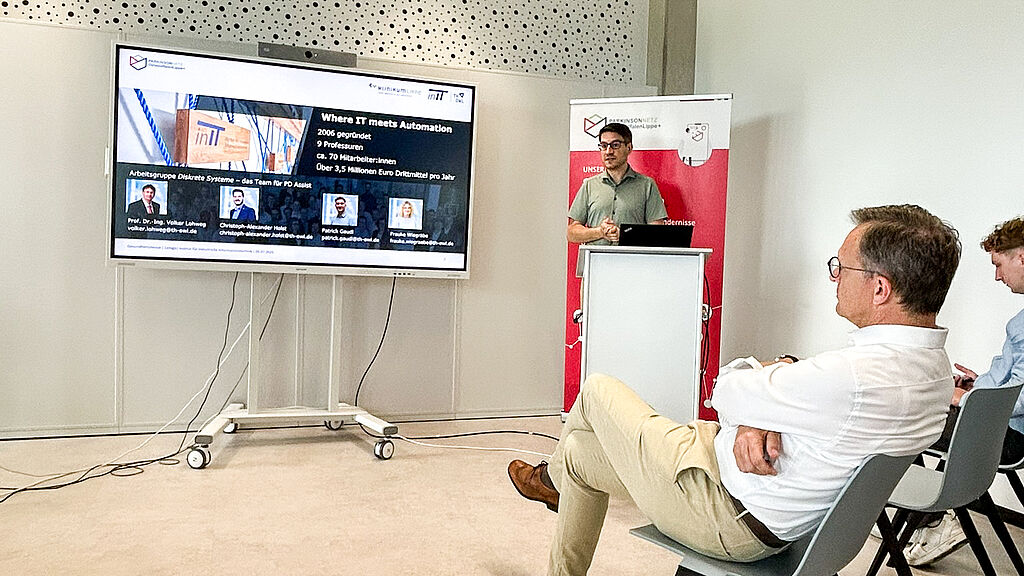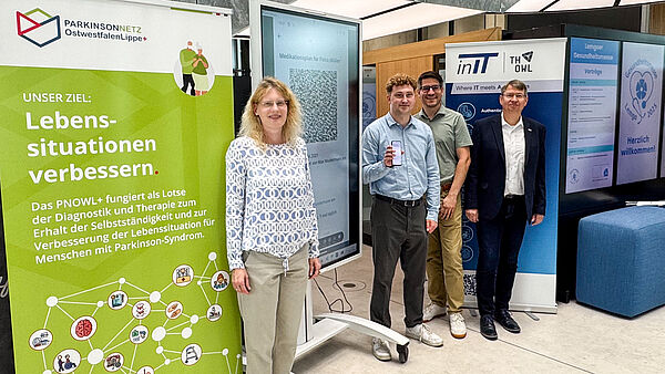 Anschließend bot der gemeinsame Informationsstand von inIT und PNOWL+ die Gelegenheit, die vorgestellten Themen im direkten Gespräch zu vertiefen. Interessierte konnten die App PD Assist vor Ort selbst testen. Frauke Wiegräbe, wissenschaftliche Mitarbeiterin bei Prof. Dr. Volker Lohweg, Christoph-Alexander Holst und Patrick Gaudl standen für Fragen zur Anwendung bereit und gaben Einblicke in die laufende Entwicklung.