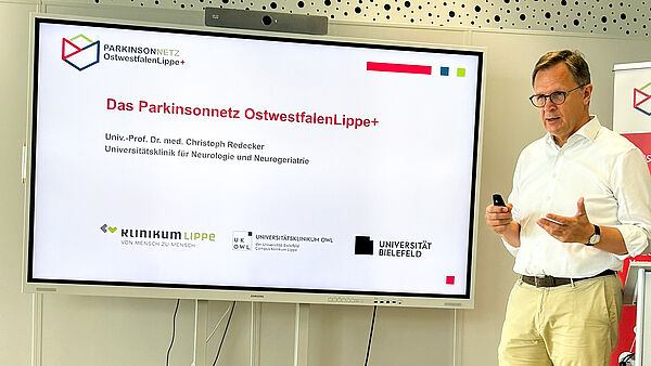Prof. Dr. Christoph Redecker stellte zunächst das ParkinsonnetzwerkOWL+ (PNOWL+) vor – ein regionales Versorgungsnetz, das medizinisches Fachpersonal, Forschungseinrichtungen sowie Betroffene und Angehörige enger miteinander verknüpft. Ziel ist eine koordinierte, alltagsnahe Versorgung auf Basis bestehender Strukturen und digitaler Lösungen.
