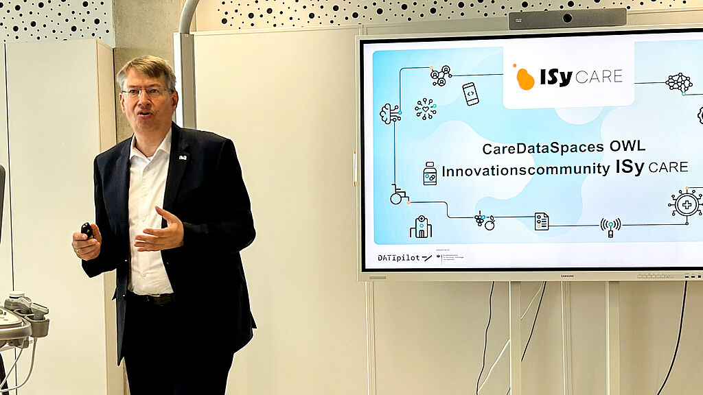 Zum Abschluss stellte Volker Lohweg die Innovationscommunity ISyCARE vor, die in OWL neue Ansätze für eine zukunftsorientierte Gesundheitsversorgung entwickelt. Ziel ist es, durch sozio-technische Innovationen Versorgungslücken zu schließen und die Selbstständigkeit Betroffener zu stärken. Mit dem Starterprojekt CareDataSpacesOWL erprobt das inIT den Aufbau sicherer und sektorenübergreifender Gesundheitsdatenräume bei gleichzeitigem Schutz der Datensouveränität der Patientinnen und Patienten.