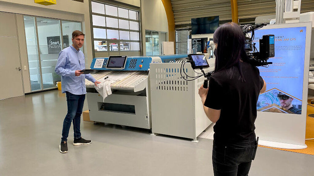 Bei einem Live-Streaming ging es im ersten Teil des Tages durch verschiedene Stationen in der SmartFactoryOWL. Hier präsentierte Nissrin Perez vom CIIT-Partner Fraunhofer IOSB-INA mit der CUNA-Realproduktion eine nachhaltige Fertigung von Mehrwegbechern, welche aus Maismehl hergestellt werden. Den dahinter liegenden Digitalen Zwilling veranschaulichte ihr Kollege Magnus Redeker. An der nächsten Station zeigte Fraunhofer-Experte Sascha Heymann die neuen Möglichkeiten für den Vertrieb. Ähnlich wie bei einem Smartphone, kauft man zukünftig Apps für die Industrie 4.0 auf digitalen Marktplätzen. Der herstellerneutrale und plattformunabhängige Marktplatz bietet Angebote für Hardware, Software und Dienstleistungen. Welche Mehrwerte durch den Einsatz digitaler Assistenz bei der Ausgestaltung menschenzentrierter Prozesse entstehen, machte Alexander Kuhn vom Institut für industrielle Informationstechnik (inIT) der TH OWL, in seinem Beitrag zur Arbeit 4.0 deutlich. „Meine Maschine zeigt mir gerade eine Fehlermeldung an. Ich könnte nun Tage damit verbringen, die Handbücher der Maschine durchzublättern und eine Option nach der anderen ausprobieren, bis ich den Fehler gefunden habe. Doch meine digitale Assistenz hilft mir, Zeit einzusparen“, sagte Alexander Kuhn und löste mit seinem IPad innerhalb kürzester Zeit das Problem der Maschine. Die etablierten Experten machten den rund 40 Zuschauerinnen und Zuschauern deutlich, welche Potentiale in der Digitalisierung stecken und welche Vorteile der Mensch durch sie generiert. Doch wo kommen die Nachwuchskräfte her, die zukünftig den Weg weiter bestreiten? Der Studiengang „Digitalisierungsingenieurwesen“ der Technischen Hochschule OWL hat genau das zum Ziel. Professor Andreas Deuter stellte diesen gemeinsam mit dem aktuellen Studenten Daniel Schramm vor.