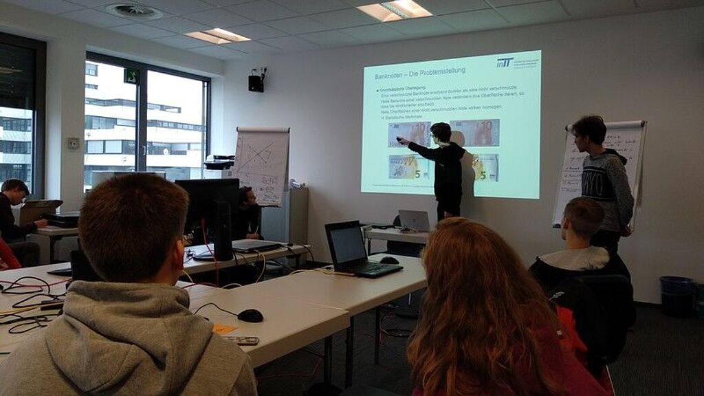 Im Workshop „Maschinelles Lernen in Bankautomaten“ befassten sich die Nachwuchswissenschaftler mit der praktischen Anwendung maschineller Lernverfahren zur Banknotenkontrolle in Bankautomaten. Anhand ausgewählter Algorithmen lernten die Schülerinnen und Schüler dabei die Basis des maschinellen Lernens kennen und welche Rolle dieses in der praktischen, industriellen Anwendung spielt.