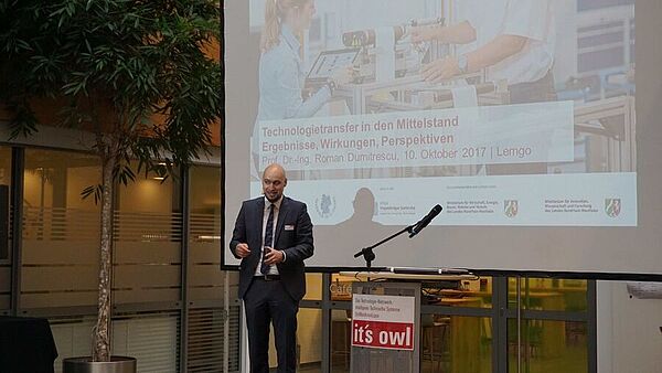 Prof. Dr. Jürgen Krahl, Präsident der Hochschule OWL, und Prof. Dr. Roman Dumitresco, Geschäftsführer it’s OWL Clustermanagement, begrüßten die Gäste aus Wirtschaft und Wissenschaft am Dienstag im CIIT. Krahl betonte: „Ein herzliches Dankeschön an den CIIT e.V. für die Möglichkeit, die it’s OWL-Transfertage in den CIIT-Gebäuden ausrichten zu dürfen. Eindrucksvoll wird hier die vielfach geforderte enge Zusammenarbeit - auf Augenhöhe - zwischen Industrie und Wissenschaft tatsächlich gelebt. Ausschlaggebend dafür ist ein Netzwerk starker Partner, in dem auch wir, die Hochschule OWL, beteiligt sind.“ Prof. Dr.-Ing. Roman Dumitrescu (Geschäftsführer it's OWL Clustermanagement) zieht ein positives Resümee: „Unser Technologietransfer aus der Forschung in die Wirtschaft ist sehr erfolgreich. In 171 Transferprojekten konnten Unternehmen neue Technologien nutzen, um konkrete Herausforderungen in der Produktion oder bei ihren Produkten zu lösen. Die Rückmeldungen sind hervorragend: 74 % der Unternehmen sind mit dem Projektablauf zufrieden. 69 % geben an, dass sie eine wesentliche Weiterentwicklung vollzogen haben. Damit leisten wir einen wichtigen Beitrag, den Mittelstand in OWL fit für Industrie 4.0 zu machen und seine Wettbewerbsfähigkeit zu steigern.“