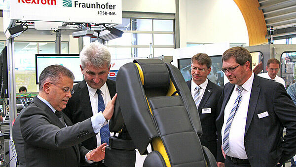 Während einer Führung durch das CIIT und die SmartFactoryOWL konnte sich der Wirtschaftsminister einen Eindruck von den verschiedenen Lemgoer Forschungsaktivitäten machen. Jens Otto, Gruppenleiter für „Cybersicherheit in der Produktion“ bei Fraunhofer, stellte dabei u. a. das kürzlich eröffnete Lernlabor vor, in dem Verfahren und Techniken für die IT-Sicherheit in der Produktion erforscht und zugleich Komponenten und Software-Module für den Schutz dieser Anlagen entwickelt werden. Pinkwart ließ sich einen simulierten Hackerangriff erläutern und tauschte sich mit den Forschern zur Notwendigkeit von IT-Sicherheit in der Industrie aus. Anschließend präsentierte Fraunhofer-Mitarbeiter Pedro Rodrigues der Delegation in der SmartFactoryOWL intelligente technische Systeme und verschiedene Technologiedemonstratoren.