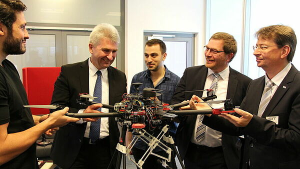 Die Möglichkeiten für Gründungsinteressierte im KnowledgeCube der Hochschule OWL unter dem Dach des CIIT fand Pinkwart besonders spannend und tauschte sich mit einigen Jungunternehmern aus, die hier industrielle Drohnen entwickeln. Er betonte dabei, „Ostwestfalen-Lippe ist unheimlich dynamisch und entwickelt aus sich selbst heraus kreative unternehmerische Ansätze“ und es gäbe hier ein „starkes unternehmerisches Engagement“.