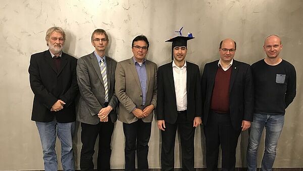 Das Bild zeigt den frisch promovierten Mohammad Elattar (4.v.l) zusammen mit Dr. Bernd Kleinjohann Leidhold (Kommissionsmitglied), Prof. Dr. Holger Karl (Zweitprüfer), Prof. Dr.-Ing. Jürgen Jasperneite (Erstprüfer), Prof. Dr. Ansgar Trächtler (Kommissionsmitglied) und Prof. Dr. Heiko Dressler (Kommissionsvorsitzender).