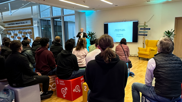 Der Titel seines Vortrages lautete: “Was soll ich im Zeitalter von ChatGPT lernen?“Er stellte ein Modell vor, nach dem wir Menschen uns durch den Dreiklang aus Beobachten, Denken und Handeln mit der Welt um uns herum auseinandersetzen. Durch Reflexion bzw. Selbstanwendung können dabei die Werkzeuge des Beobachtens, Denkens und Handeln selbst laufend verbessert und so Fortschritt erzielt werden. Deshalb ermutigte er die Studierenden, sich diesen drei Bereichen gleichermaßen zu widmen und keinen davon anderen zu überlassen.