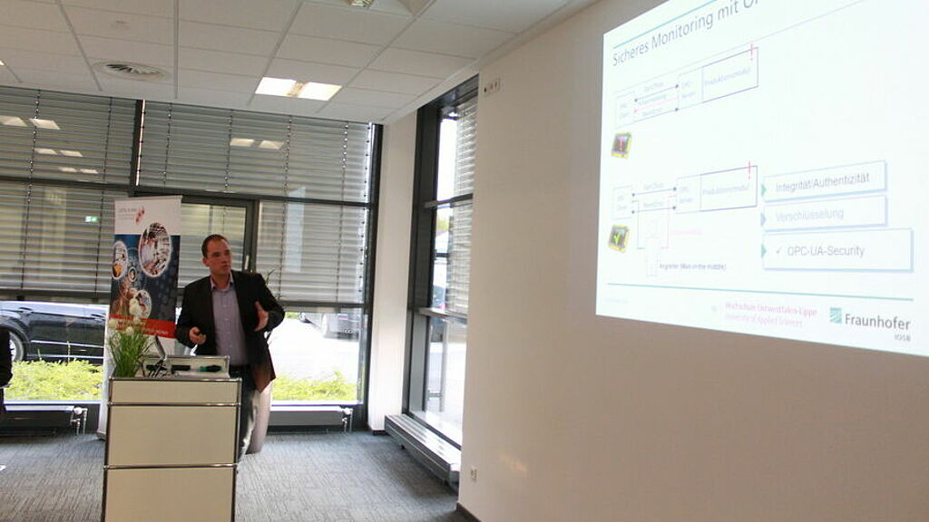 Dr. Alexander Maier (Fraunhofer IOSB-INA) presented the case study “Condition Monitoring”, Florian Pethig (Fraunhofer IOSB-INA) explained the communication with architectures like OPC UA and Jens Otto (Fraunhofer IOSB-INA) demonstrated together with Andreas Schmelter the necessity of safety concepts. All in all participants gained extensive insights in the potentials and risks of the connected factory of the future.