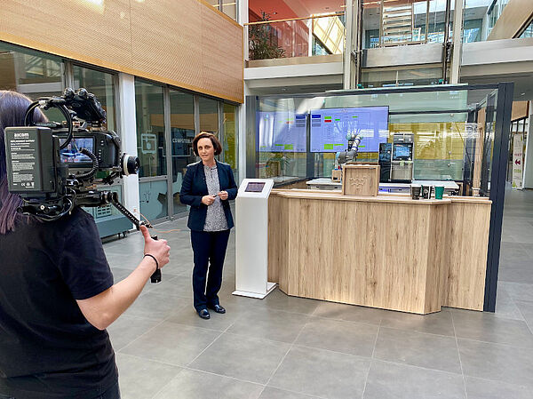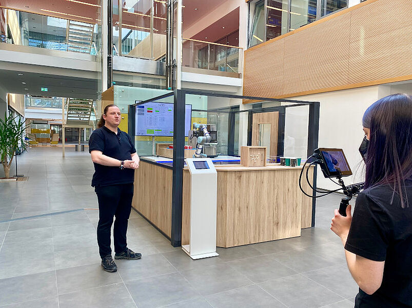 After a short break, the online theme day continued in the CIIT building. Here, it has recently become possible to have your coffee handed to you by a robot barista. In order to realize this, an interdisciplinary team of scientists worked on the implementation in the past months. Natalia Moriz and Philip Priss from InIT, Andreas Otto from Phoenix Contact and Sven Eikelmann and Nikolai Thiessen from Melitta presented the process on behalf of the entire team of about 15 people. The work paid off: the robot barista, named "CinITo", was able to successfully hand over her desired latte to CIIT Managing Director Anja Moldehn, who acted as moderator throughout the day. At the end of the day, Philip Kleen from Fraunhofer IOSB-INA presented the AutoS2 project, which is working on the automation of risk assessment for machine safety.