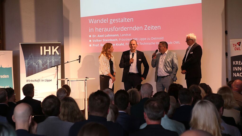 "How can change be shaped in challenging times?" This question was at the centre of the panel discussion moderated by Julia Wunderlich (FTZ, Transfer and Research Communication). She discussed current and future developments and research activities with TH OWL President Professor Dr. Jürgen Krahl, District Administrator Dr. Axel Lehmann and Volker Steinbach, President of IHK Lippe, as well as necessary political and entrepreneurial measures, but also existing risks for the region.