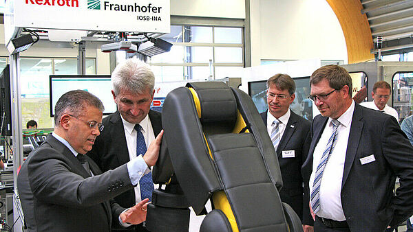 With a guided tour at CIIT and SmartFactoryOWL Pinkwart could gain insights in the various research activities. Jens Otto, group leader “Cyber Security in Production” of Fraunhofer, introduced the recently inaugurated learning lab, where approaches and techniques for IT-security in production and components and techniques for IT security in production are developed. A simulated hacker attack was demonstrated to Pinkwart. He also exchanged views with researchers about the requirement of IT security in Industry. Subsequently Pedro Rodriques (SmartFaytoryOWL) presented intelligent technical systems and technology demonstrators.