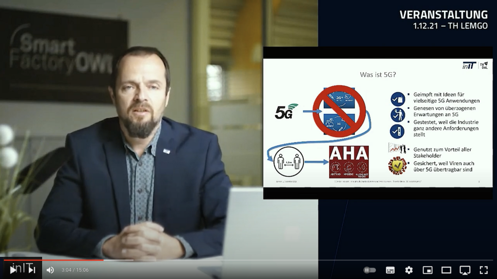 Participants were able to follow around 20 presentations at the hybrid event of the Institute Industrial IT - inIT at the OWL University of Applied Sciences and Arts. The speakers reported live from the SmartFactory on Dec. 1, 2021, remotely from their home offices or via cinematic inserts. Also live, moderator Tobias Häusler led the 7-hour streaming format. He is a journalist at WDR, moderates scientific topics also with a focus on 5G and was enthusiastic about the interesting and diverse contributions from science, institutions and industry.