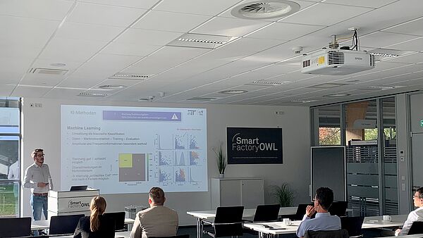 Which methods are suitable and for which applications they are used was the aim and topic of this event. Prof. Dr. Volker Lohweg, M.Sc. Anton Pfeifer and M.Sc. Christoph-Alexander Holst from inIT gave presentations to the interested SMEs on Artificial Intelligence methods that are suitable for analysing scarce production data. M.Sc. Nissrin Perez from Fraunhofer IOSB-INA showed practical application examples of AI in production plants from SMEs. Different optimisation goals were presented with regard to sustainability, efficiency and quality.
