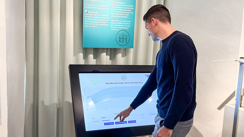 The demonstrator, entitled ‘Your age. Your height. Model meets reality,’ uses a low-threshold example to show how AI models learn from data and make predictions based on it. Visitors can add data points themselves – such as age and height – and observe how this changes the models' predictions.